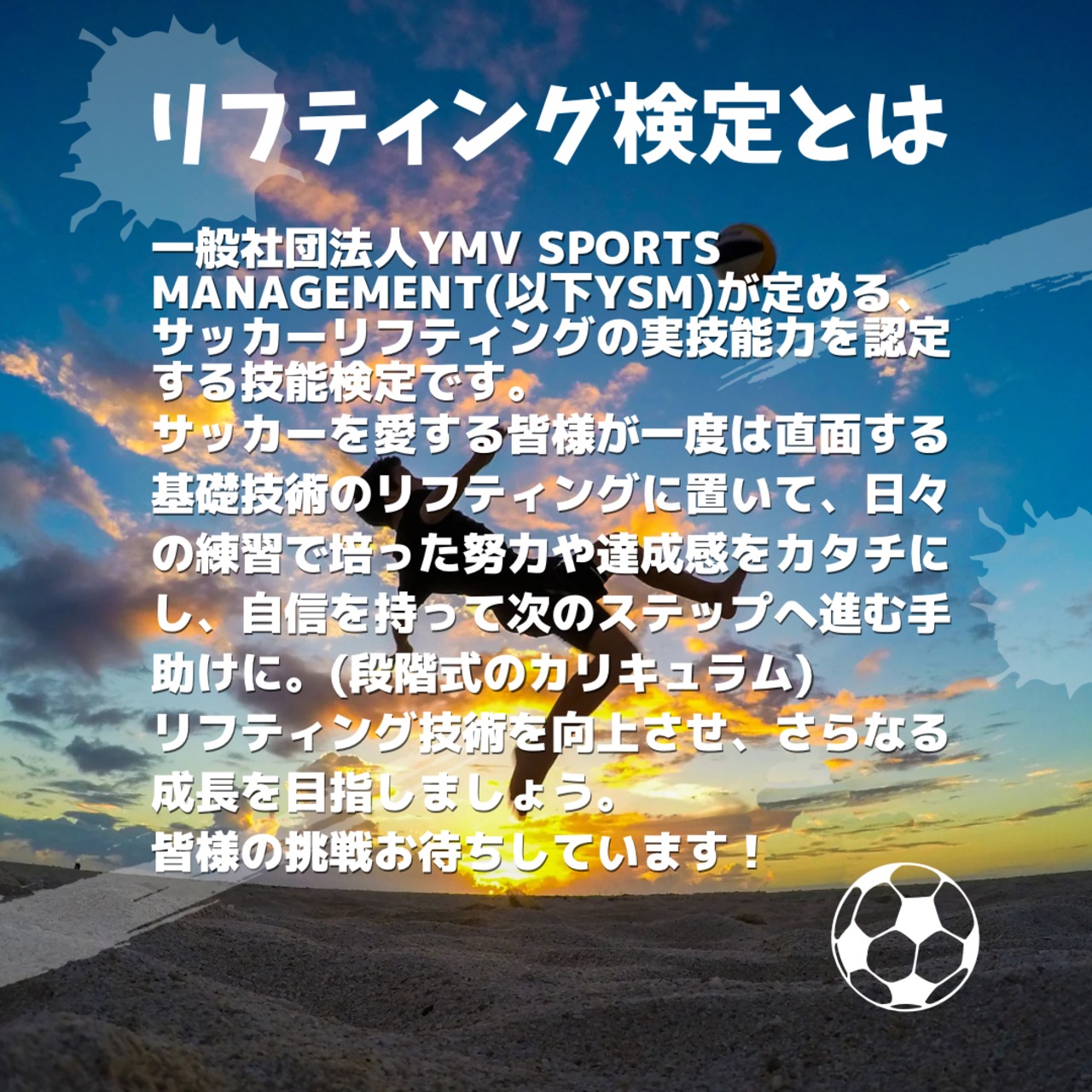 一般社団法人YMV SPORTS MANAGEMENT(以下YSM)が定める、サッカーリフティングの実技能力を認定する技能検定D級です。