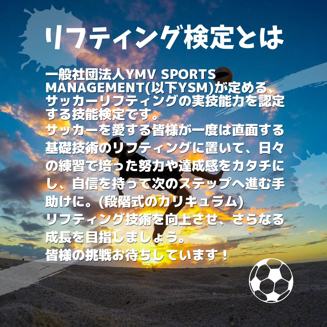 一般社団法人YMV SPORTS MANAGEMENT(以下YSM)が定める、サッカーリフティングの実技能力を認定する技能検定C級です。
